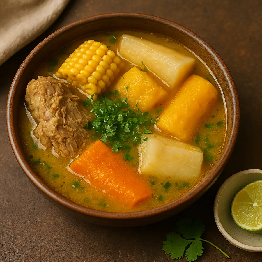 Aussi appelé mondongo quand il est à base de tripes ou de pieds de porc, il est souvent servi comme plat du lendemain de fête, pour « remettre les idées en place ». Il peut aussi être plus simple, avec uniquement du poulet ou du bœuf, mais toujours accompagné de légumes locaux et d’une coriandre bien présente.